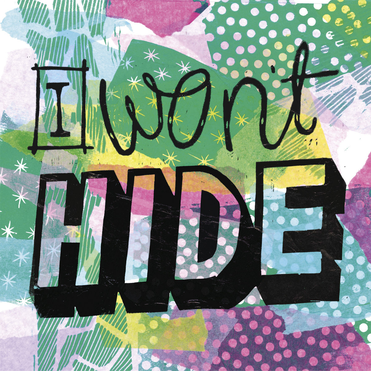 “The original artwork is a series of layered hand-cut Linocut prints. I played around with the opacity of the inks and papers building on top of a printed Chine Colle base layer. Some of the base print blocks were recycled and I cut unto them forming new interesting patterns. Inspired by the typography style of traditional sign painting a pieced together the text. The top layer needed to shout out the phrase ‘I Won’t Hide’.